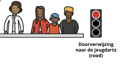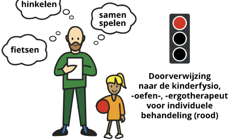 Voor kinderen met een rode score en duidelijke belemmeringen wordt, met toestemming van ouders, een consult bij de jeugdarts aangevraagd. De jeugdarts beoordeelt of er een onderliggende oorzaak voor de motorische achterstand is en/of, naast verwijzing naar een kinderfysio-oefentherapeut, verwijzing naar een kinderarts of revalidatiearts nodig is.