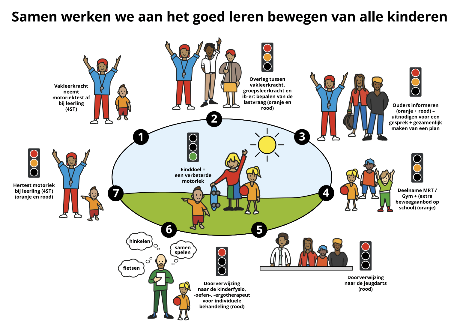 Voor kinderen met een rode score en duidelijke belemmeringen wordt, met toestemming van ouders, een consult bij de jeugdarts aangevraagd. De jeugdarts beoordeelt of er een onderliggende oorzaak voor de motorische achterstand is en/of, naast verwijzing naar een kinderfysio-oefentherapeut, verwijzing naar een kinderarts of revalidatiearts nodig is.